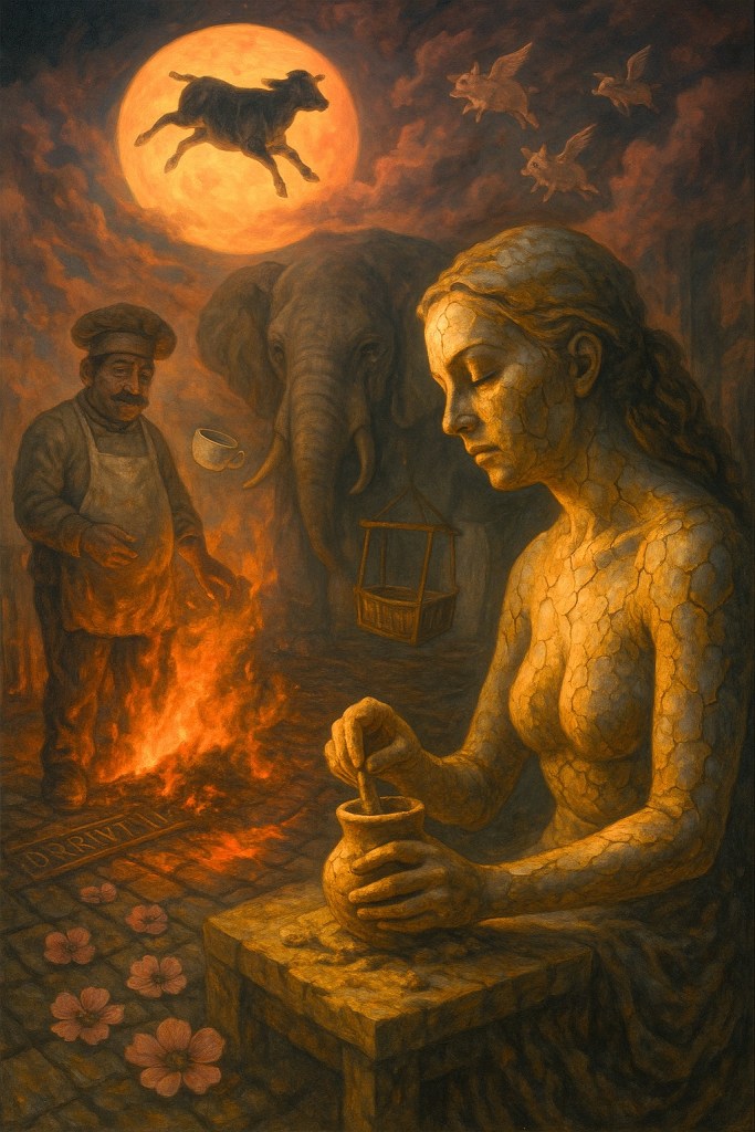 This poem tumbles through a surreal nursery, where idioms curdle and lullabies unravel. A fair lady shapes gold from dust, the Muffin Man kindles fire instead of flour, and flying pigs signal impossible beginnings. What starts in whimsy ends in quiet ruin—a cradle of contradictions where even patty cakes fall. Here, the rhythm is real, but the meaning slips, keep your options open.