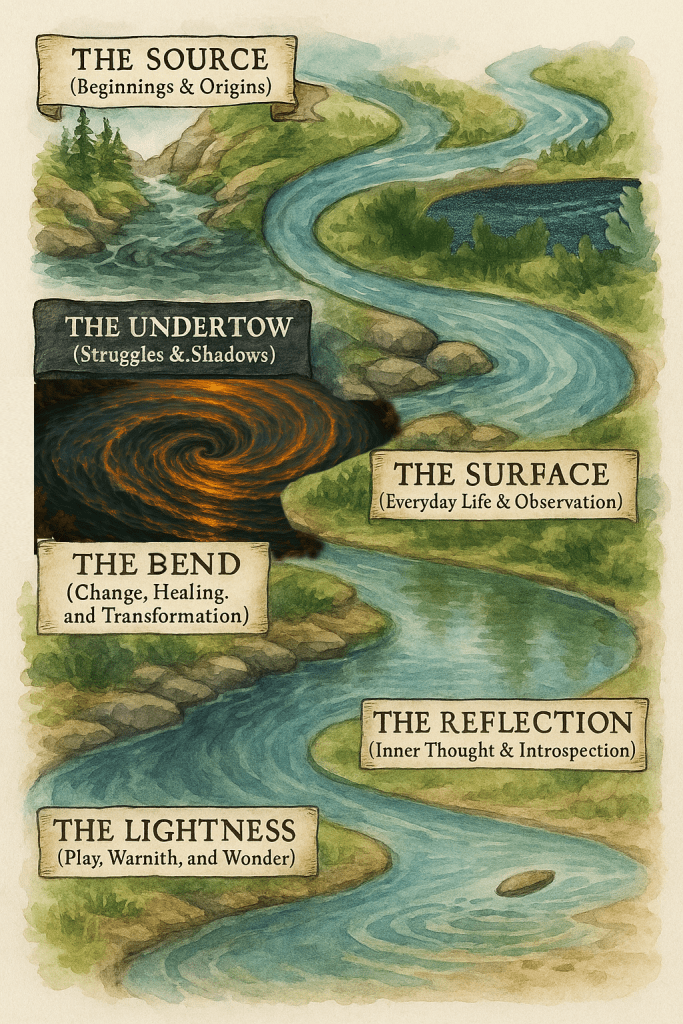 Every current tells a story, some rush with force, others whisper along the banks. Here, I’ve sorted my writing like the flow of a river: beginnings and storms, reflections and healing bends. Whether you’re caught in the undertow or floating gently downstream, I hope you find something that resonates and carries you a little further on.